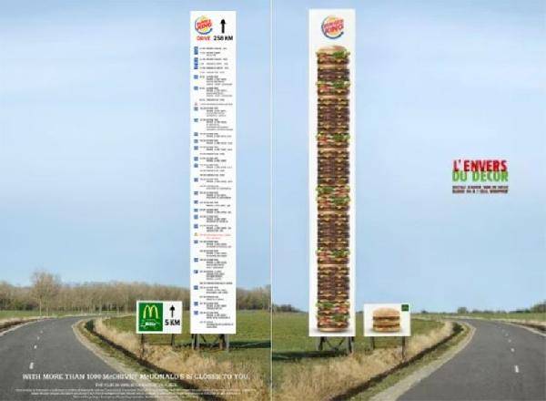 比如,麦当劳在公路指示牌上面写着:前方麦当劳5公里,并在旁边竖起一座指示牌表明距汉堡王256公里,汉堡王只回应了一个夹着56层肉饼的巨型皇堡。