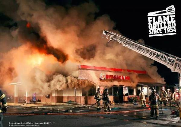 比如,美国汉堡王的三家连锁店发生火灾后,它才不屑打官腔,它把3场大火的场景,加上了自己的logo与一句“专注火烤烘焙63年”,叫板麦当劳的油炸汉堡不正统。