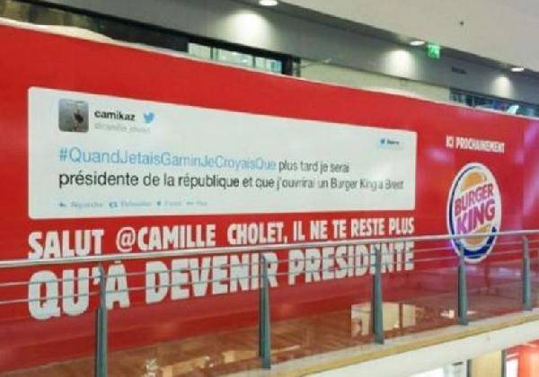 粉丝:哪天我做了法国总统我就把汉堡王开到布赖斯特。汉堡王:你好,我们来了,现在就等你成为总统了。