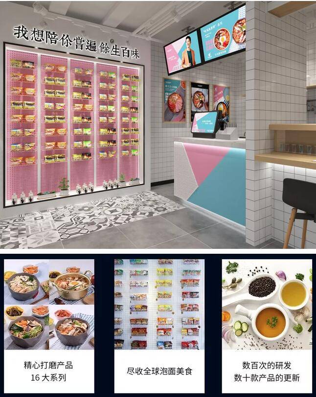 总裁严军告诉记者,他们主要从三个方面进行这一品类的定位革新:一是汇聚了全世界最受欢迎的泡面产品,韩国、台湾、泰国、新加坡、缅甸、香港等,稳定合作,保证货源充足;二是产品的口味,每一款泡面都设计了不同的汤底,“宜百味”也表达了“一百种不同口味”的丰富性;三是从门店体验、品牌定位上进行提升,更贴近95、00后的消费需求,成为一碗有内涵的“治愈系”泡面。