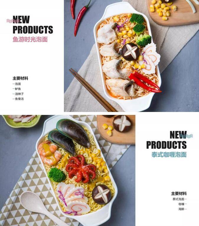 一个普通的泡面,经过巧妙的搭配、碰撞,变得丰富多彩,可以满足不同口味的喜好,既可一人食,也可多人分享,小食大作,玩出花样。同时,虾、蟹、贝类的加入,也可以提高产品价值,脱离传统泡面的Low食形象。