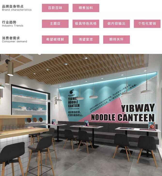 年轻人工作压力大,希望被理解,渴望宣泄和被关怀,因此,宜百味泡面食堂在门店打造方面增加了诸多互动细节,让顾客在这里可以收获除了吃饭之外的一种情感,成为一家有治愈功能的泡面馆。具体表现为: