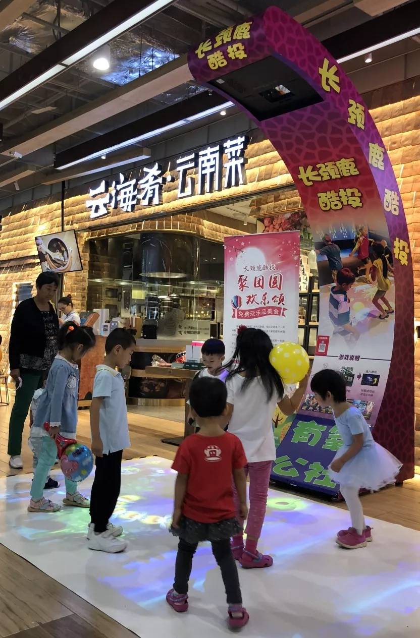 小朋友路过餐厅,发现同龄孩子正在玩“脚踩地鼠”的游戏,即把传统的电玩打地鼠,改成了脚踩的形式,蹦蹦跳跳十分开心。