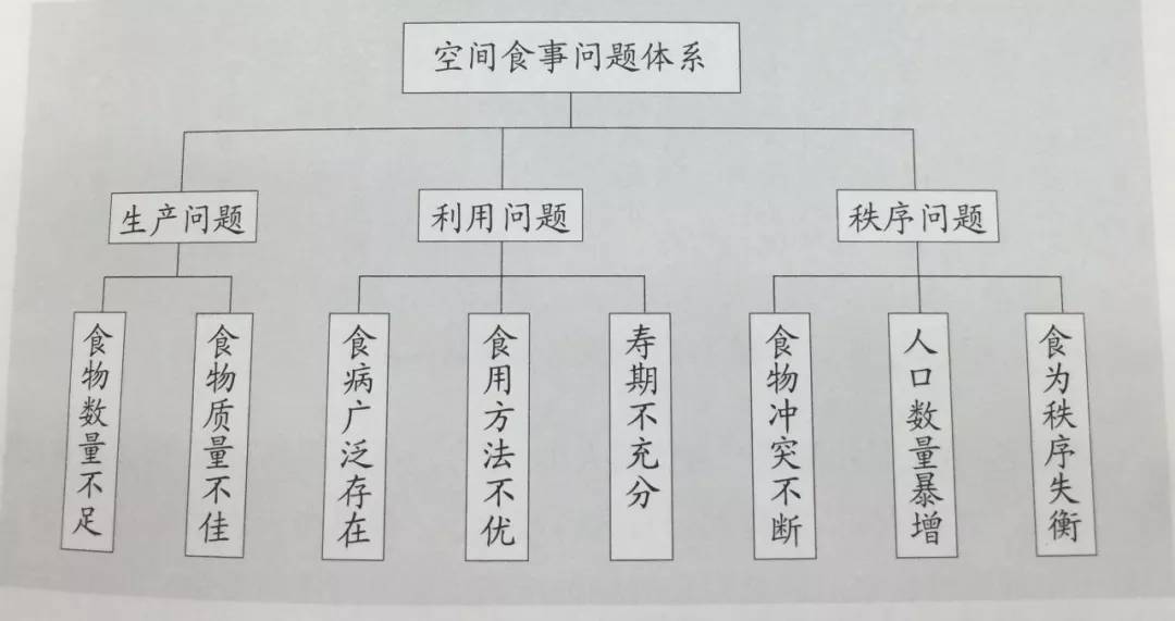 从空间角度上看,他认为食物问题分为食物的生产问题、食物的利用问题、食为的秩序问题。生产的问题,主要体现在数量、质量2个方面;利用问题主要体现在食病广泛存在、食用方法不当,寿期不充分3个方面;秩序问题主要体现在因食物引发的争端与冲突不断、人口数量暴增等方面。