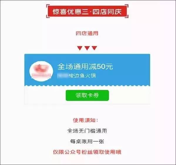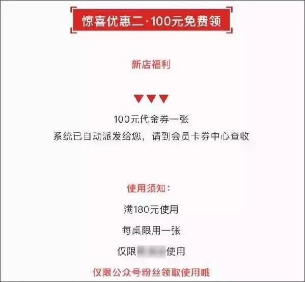 为了达到开业即火的效果,策划公司还为我策划了会员折扣这个活动,只要关注店面微信公众平台的顾客,都会收到后台发送的一张100元代金券,满180元就可以使用。