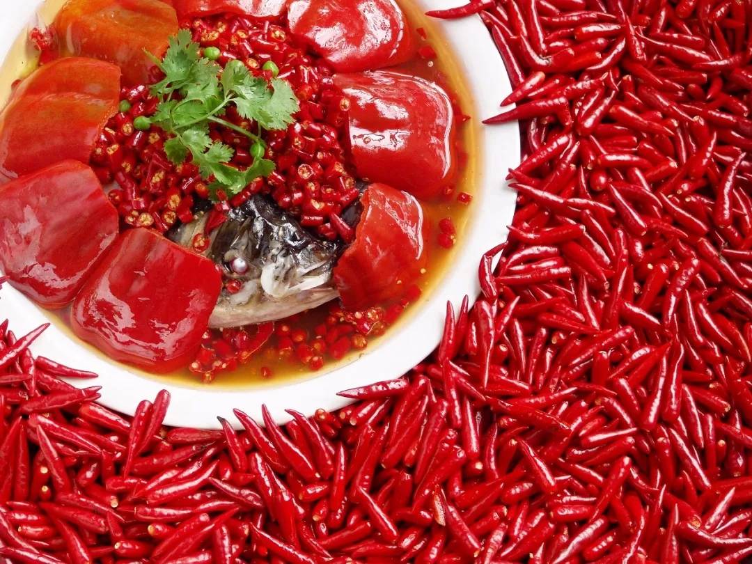 盛夏时节点这道菜,顾客可先喝汤,开胃解暑。而且装盘也很讲究,用大红灯笼辣椒铺盖,吃时揭开大红辣椒,就会见到鱼头,所以叫开门红。