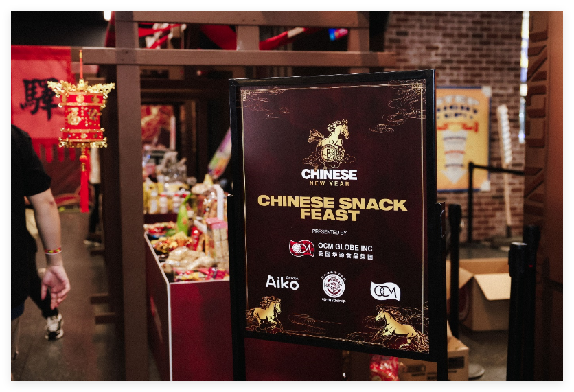 本次活动期间,OCM在场馆主通道区域精心打造新春主题展位,以中国传统红金色调为视觉主轴,结合“马年”文化元素设计,营造浓厚节日氛围。现场观众不仅可以品尝精选中国零食与亚洲特色产品,还可参与互动打卡与礼品赠送活动,进一步增强品牌与消费者之间的连接。